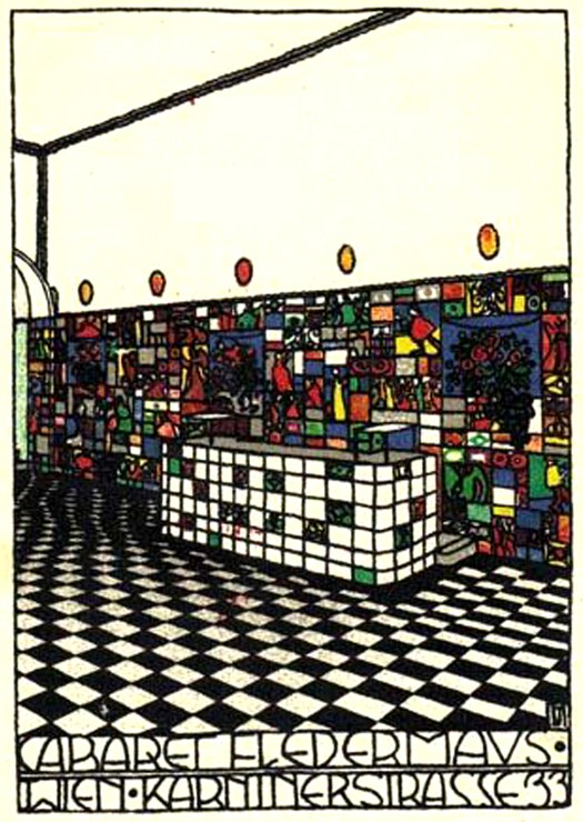 « Le cabaret Fledermaus, oeuvre d’art totale, est un merveilleux petit lieu en marbre blanc et gris, avec un bar multicolore, sous un plafond tout blanc. Où qu’on regarde, ce ne sont qu’objets tendres, singuliers, réalisés avec amour » écrivit le poète Peter Altenberg lors de l’inauguration en octobre 1907